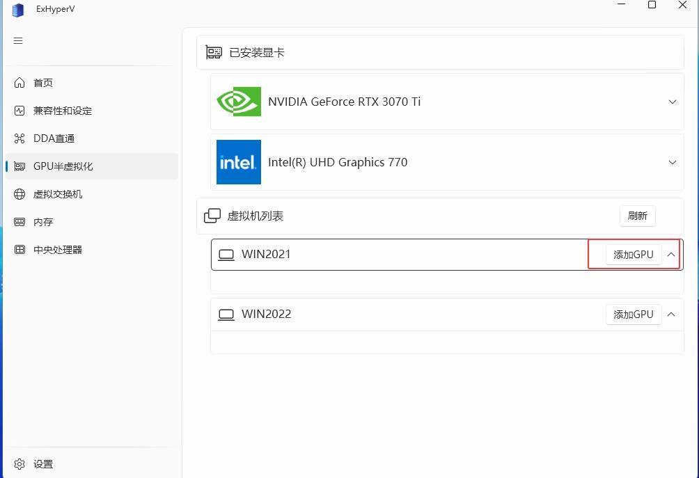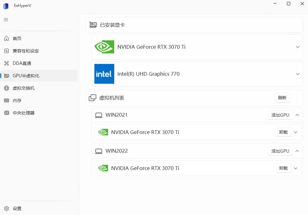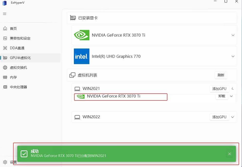 【GPU半虚拟化】→虚拟机列表 例如WIN2021 →【添加GPU】→【GPU选择】选择独立显卡 例如3070Ti→【确定】→【驱动注入】例如 partition 3 (126.33Gb)-Windows→【确定】→提示:成功 已分配到WIN2021