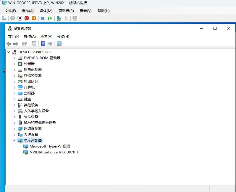 打开WIN2021的虚拟机,查看设备管理器,显示适配器发现3070Ti显卡,说明配置成功