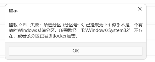 挂载 GPU 失败:所选分区(分区号:3,已挂载为 E:)似乎不是一个有效的Windows系统分区。