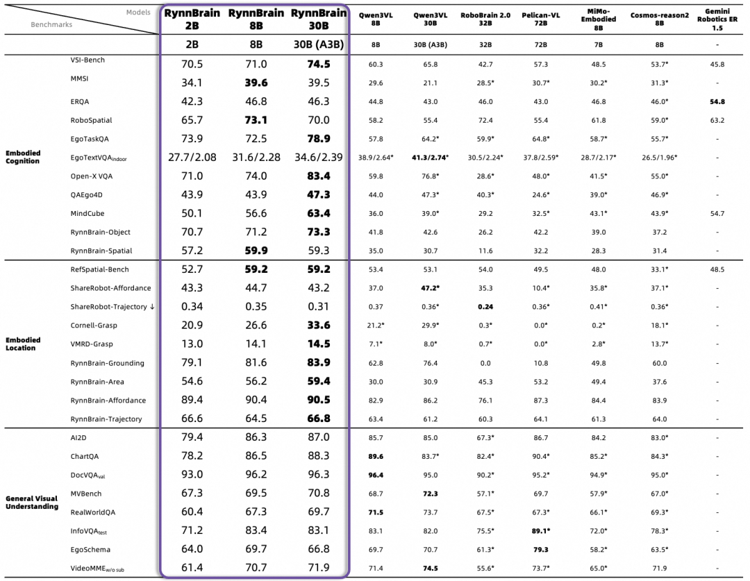 RynnBrain 在 Qwen3-VL 基础上训练,使用自研的 RynnScale 架构进行训练优化,同等资源加速两倍,训练数据超过 2000 万对。结果显示,RynnBrain 能力全面,性能领先,在 16 项具身开源评测榜单上刷新纪录(SOTA),包括环境感知与对象推理、第一人称视觉问答、空间推理、轨迹预测等,超越了谷歌 Gemini Robotics ER 1.5、英伟达 Cosmos Reason 2 等具身顶尖模型。